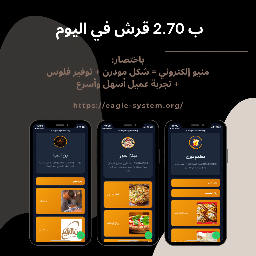 منيو إلكتروني احترافي مع Eagles System – الحل الذكي لإدارة مطعمك في 2026 في عالم المطاعم والكافيهات السريع، بقى المنيو الإلكتروني مش رفاهية… لكنه ضرورة. مع Eagles System تقدر تنقل مطعمك لمستوى احترافي حديث يوفر تكلفة، يزيد المبيعات، ويحسن تجربة العميل في نفس الوقت. ما هو المنيو الإلكتروني؟ المنيو الإلكتروني هو قائمة طعام رقمية يقدر العميل يفتحها من خلال QR Code باستخدام الموبايل، بدون الحاجة إلى منيو ورقي. بمجرد مسح الكود، تظهر كل الأصناف بالصور…