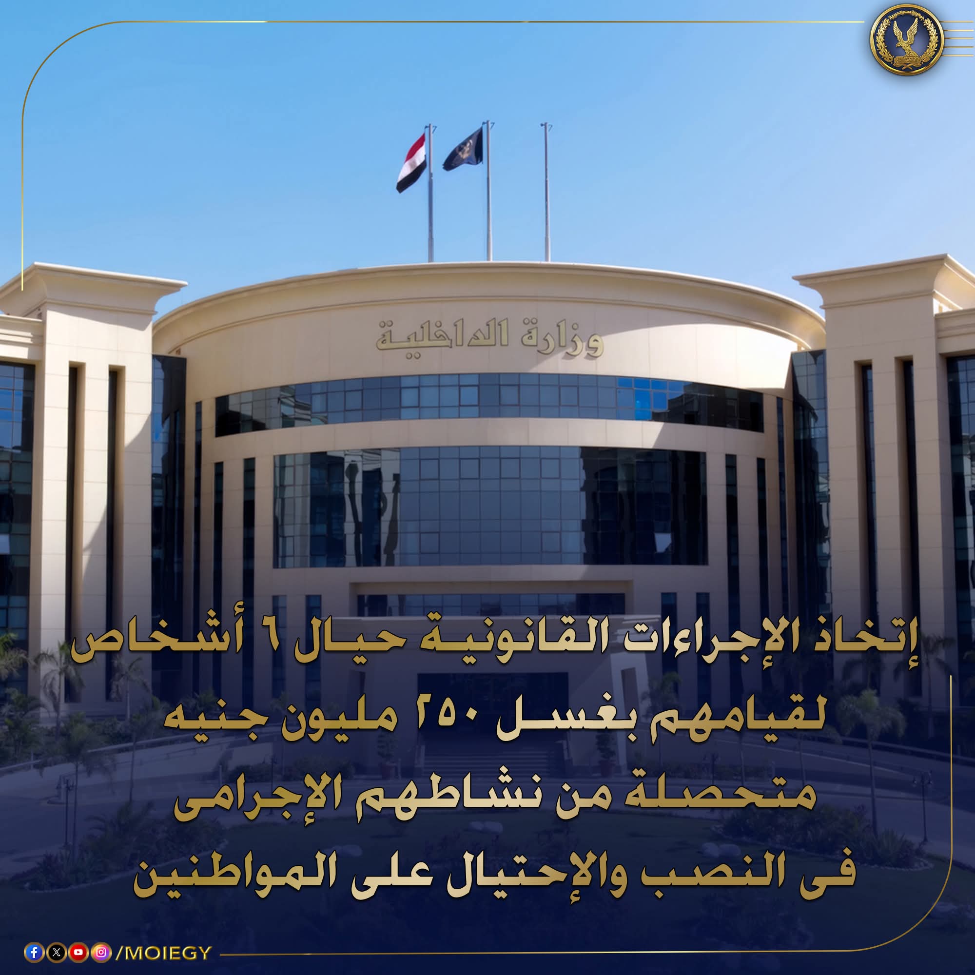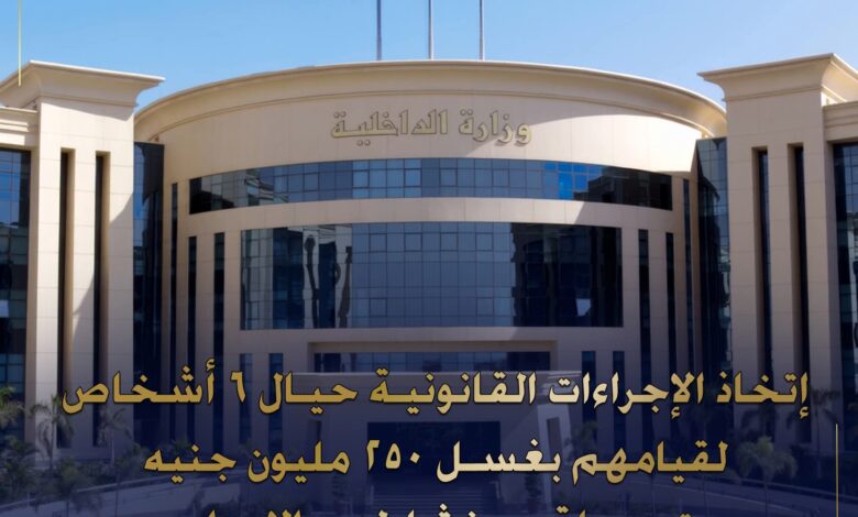إتخاذ الإجراءات القانونية حيال ٦ أشخاص لقيامهم بغسل ٢٥٠ مليون جنيه متحصلة من نشاطهم الإجرامي في النصب والإحتيال على المواطنين