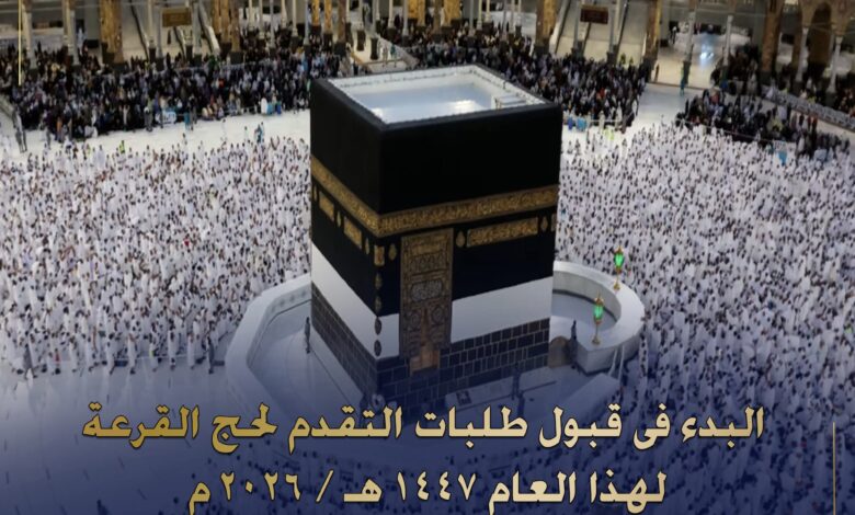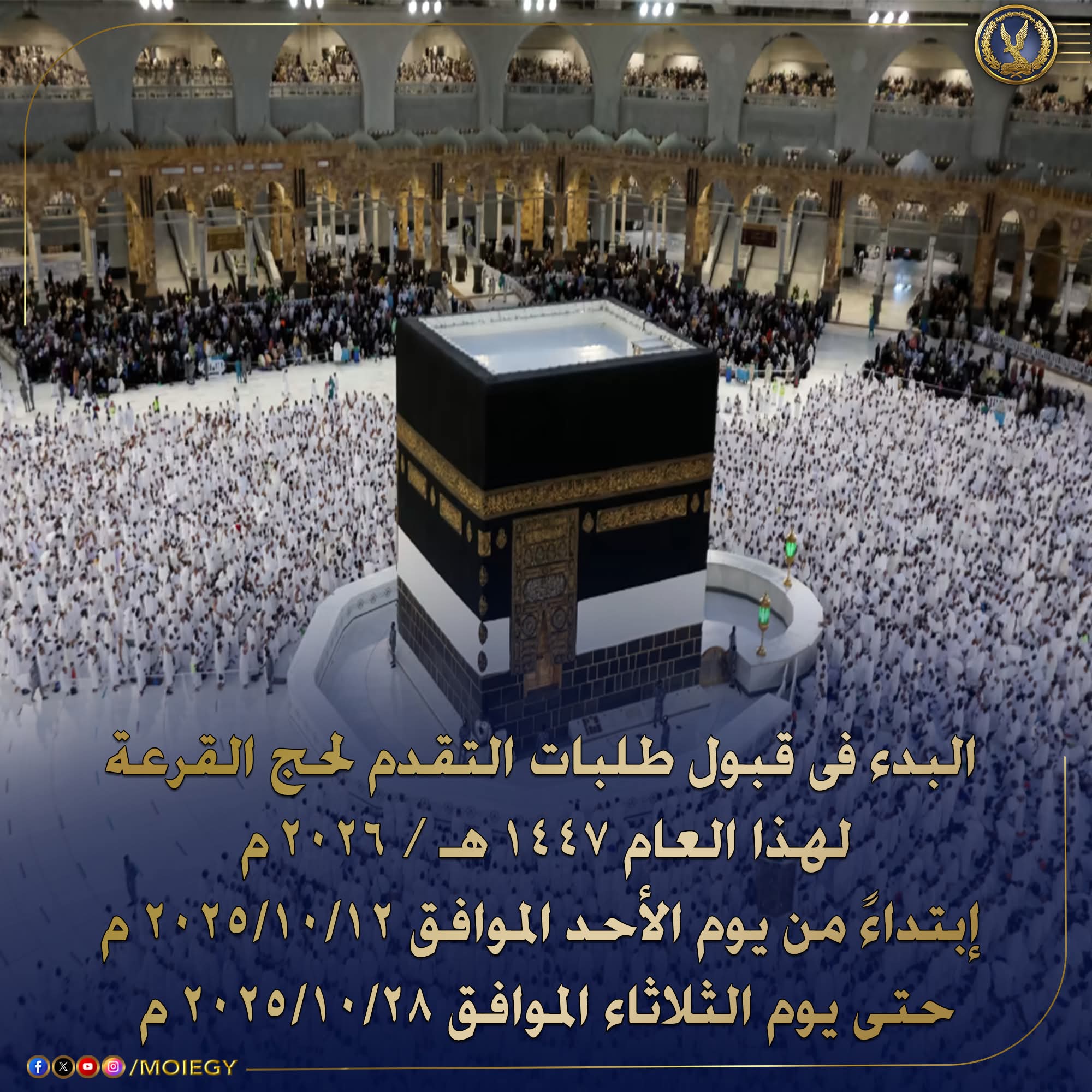 البدء فى قبول طلبات التقدم لحج القرعة لهذا العام ١٤٤٧ هـ / ٢٠٢٦ م إبتداءً من يوم الأحد الموافق ٢٠٢٥/١٠/١٢ م حتى يوم الثلاثاء الموافق ٢٠٢٥/١٠/٢٨ م