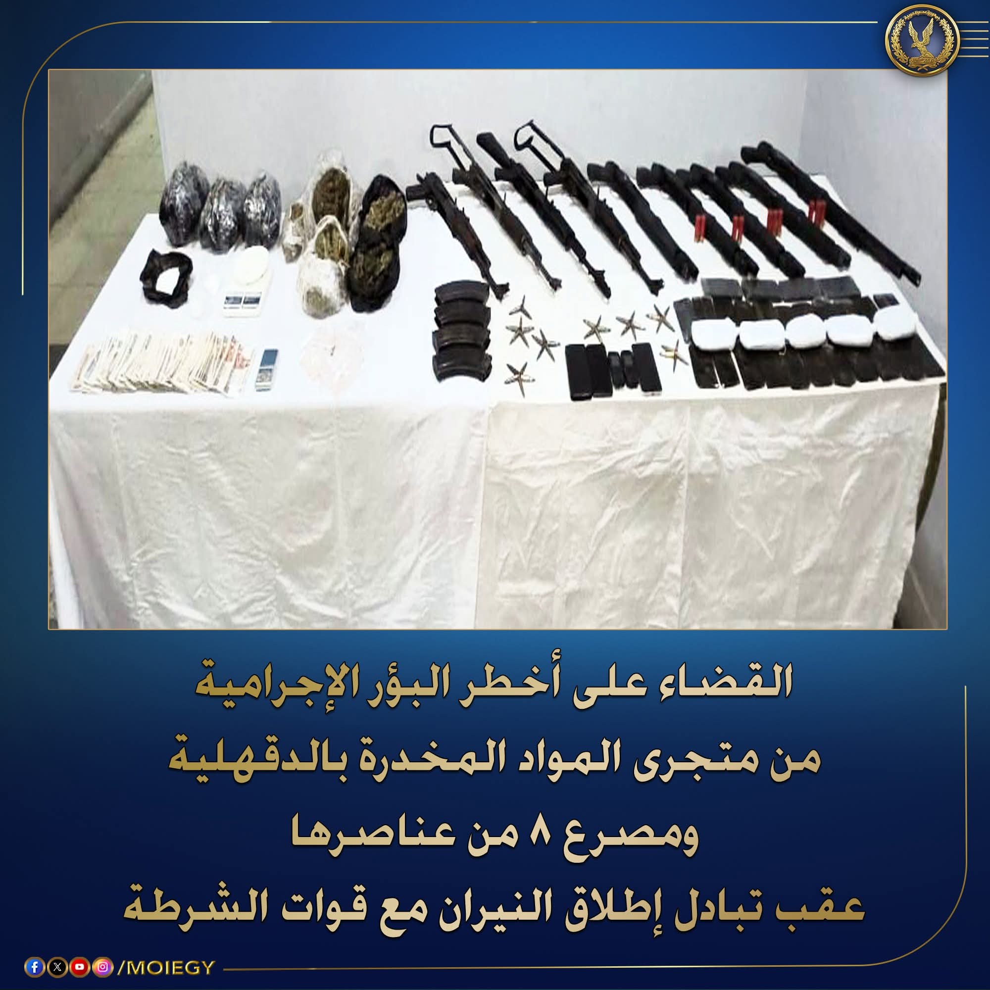 تمكنت أجهزة البحث الجنائى بمديرية أمن #الدقهلية بمشاركة قطاع الأمن العام من رصد بؤرة إجرامية للإتجار بالمواد المخدرة تضم (9 عناصر جنائية شديدة الخطورة سبق إتهامهم والحكم عليهم فى جنايات أبرزها “سرقة بالإكراه، إتجار بالمخدرات وحيازة أسلحة نارية، إطلاق أعيرة نارية، حريق عمد”) قامت بفرض سيطرتها على إحدى القرى بمركز شرطة منية النصر معززةً سطوتها الإجرامية من خلال حيازة أسلحة نارية.