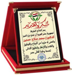 الملقب: بشيخ مخترعيين مصر والعرب عضو مجلس علماء مصر وعضو الاتحاد العالمي للمخترعين وعضو الاتحاد العالمي للتنمية والحرية والسلام وعضو المركز الفرنسي الدولي للعلماء والمخترعين … والحاصل تكريمات كثيرة من بينها ثلاث شهادات دكتوراه فخرية وشرفية الأخيرة من الجامعة الأمريكية ودبلوم من المركز الفرنسي الدولي للعلماء والمخترعين