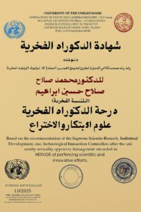 أولا: ـ 6 اختراعات في المجال الطبي منها : ـ 1 جهاز لعلاج آلام الفقرات الظهرية والفقرات العنقية له أكثر من 20 تصميم بطرق أداء متنوعة يعمل يدوي وبالكهرباء ــــ2 قناع واقي خاص بالمرضى المصابين بالفايروس وخاص بالسادة الإطباء وطاقم التمريض وكل المخالطين