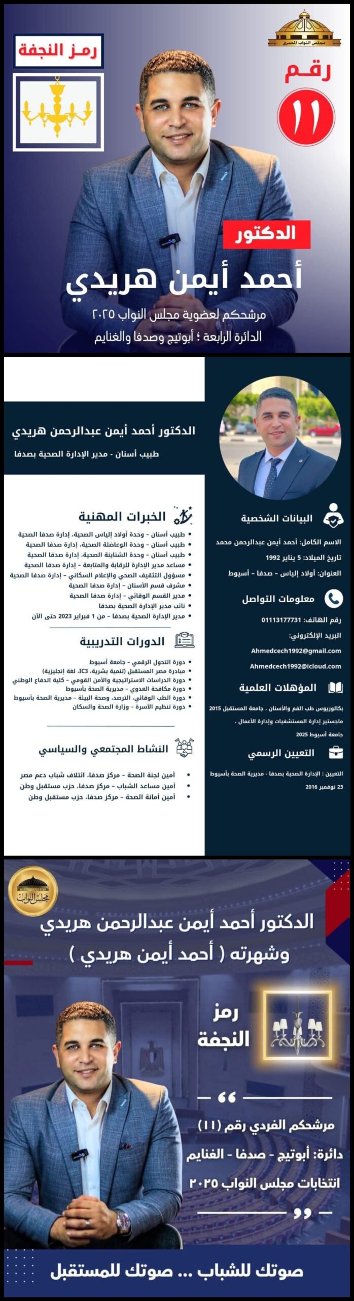 يشكل دخول الأطباء والكوادر الصحية إلى خريطة التمثيل النيابي ظاهرة لافتة في المشهد المحلي، لا سيما عندما يجمع المرشح بين السيرة المهنية والخبرة الإدارية والعمل الميداني. من هذا السياق تبرز شخصية الدكتور أحمد أيمن عبدالرحمن هريدي، طبيب أسنان يشغل منصب مدير الإدارة الصحية بصدفا، ويخوض انتخابات مجلس النواب 2025 مرشحًا فرديًا عن دائرة أبوتيج ـ صدفا ـ الغنايم، حاملًا رمز “النجفة”. (facebook.com)