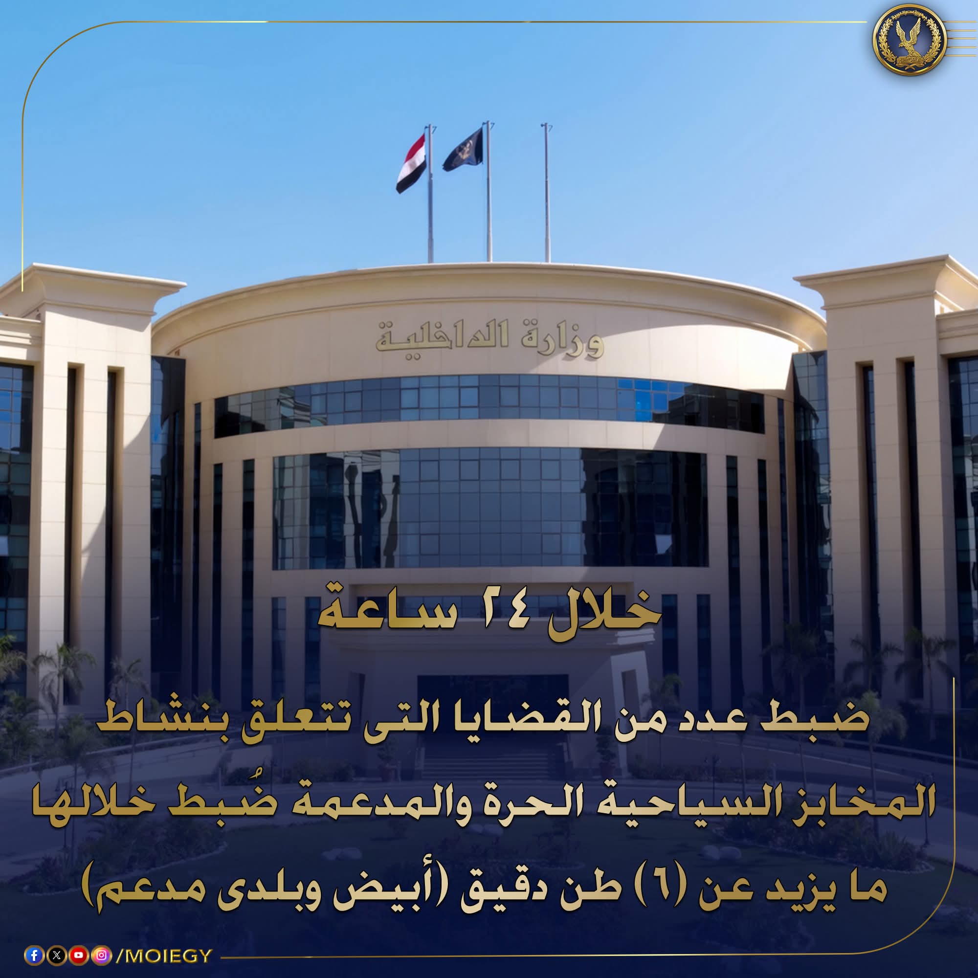 إستمراراً لجهود أجهزة وزارة الداخلية لحماية جمهور المستهلكين وإحكام الرقابة على الأسواق والتصدى لمحاولات التلاعب بأسعار الخبز والبيع بأزيد من السعر المقرر وعدم الإعلان عن الأسعار .. فقد واصل قطاع الأمن العام والإدارة العامة لشرطة التموين والتجارة بالتنسيق مع مديريات الأمن، حملاتهم المكبرة لضبط الجرائم التموينية والتى أسفرت عن ضبط عدد من القضايا التى تتعلق بنشاط المخابز السياحية الحرة والمدعمة خلال 24 ساعة ضُبط خلالها ما يزيد عن (6) طن دقيق (أبيض وبلدى مدعم).