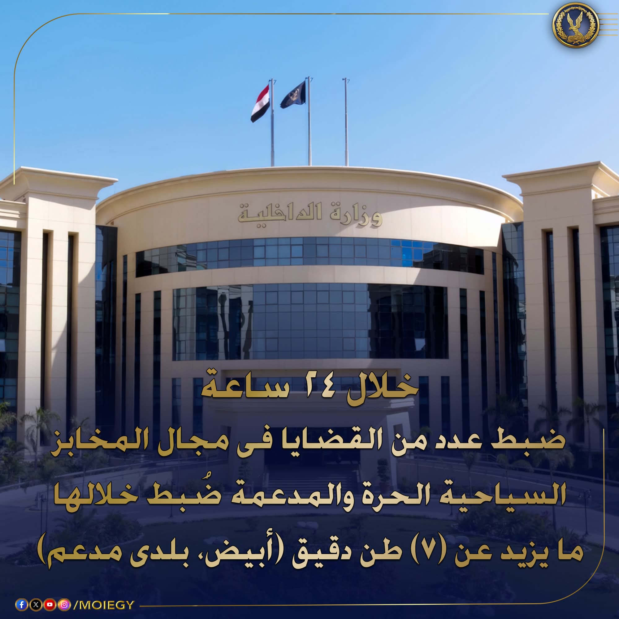 إستمراراً لجهود أجهزة وزارة الداخلية لحماية جمهور المستهلكين وإحكام الرقابة على الأسواق والتصدى لمحاولات التلاعب بأسعار الخبز والبيع بأزيد من السعر المقرر وعدم الإعلان عن الأسعار .. فقد واصل قطاع الأمن العام والإدارة العامة لشرطة التموين والتجارة بالتنسيق مع مديريات الأمن، حملاتهم المكبرة لضبط الجرائم التموينية والتى أسفرت عن ضبط عدد من القضايا التى تتعلق بنشاط المخابز السياحية الحرة والمدعمة خلال 24 ساعة ضُبط خلالها ما يقرب من (7) طن دقيق (أبيض وبلدى مدعم).