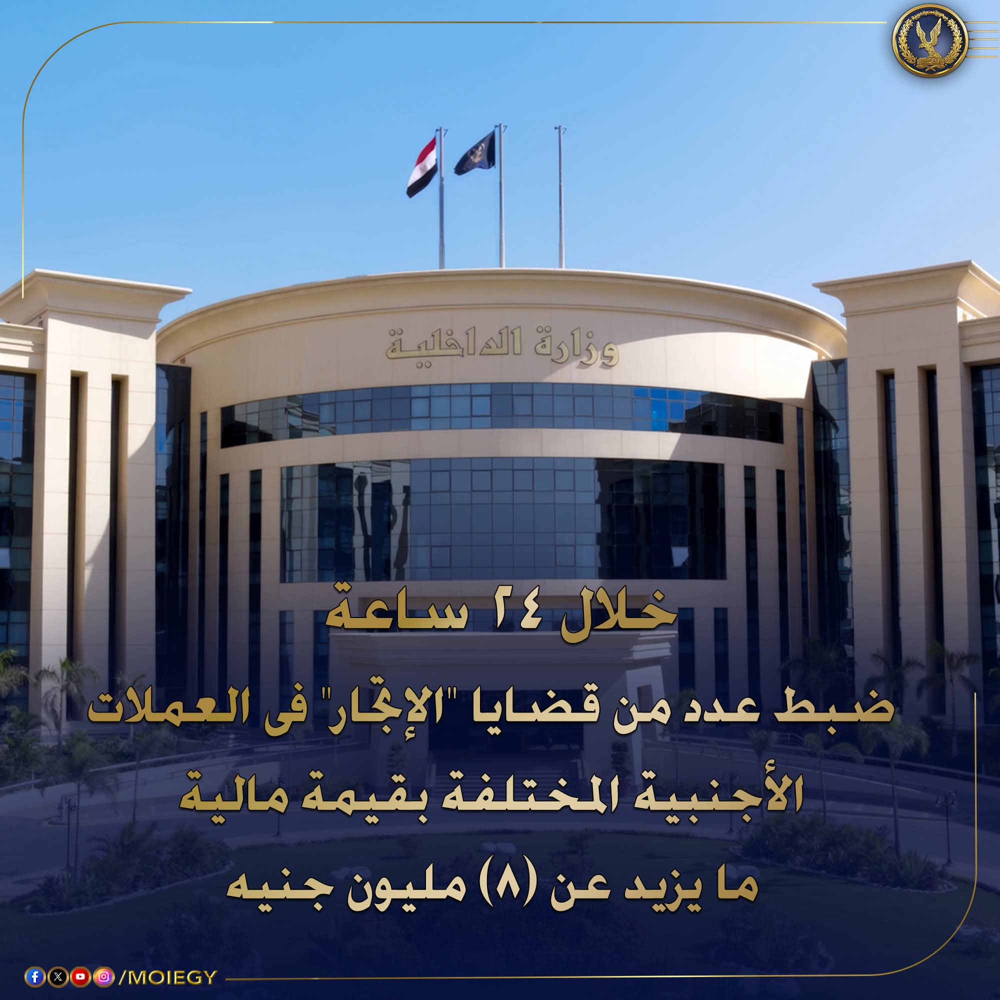 خلال ٢٤ ساعة ضبط عدد من قضايا “الإتجار” في العملات الأجنبية المختلفة بقيمة مالية ما يزيد عن (۸) مليون جنيه