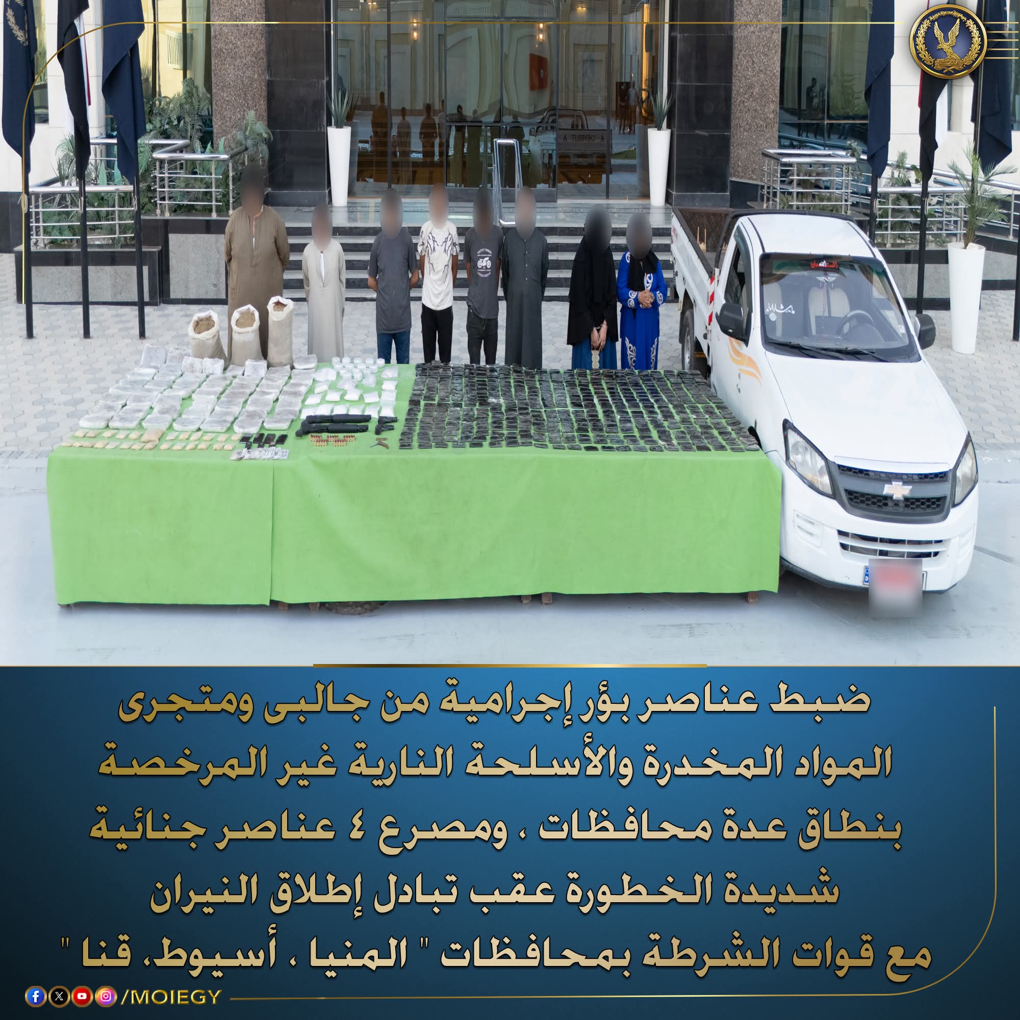 ضبط عناصر بؤر إجرامية من جالبي ومتجرى المواد المخدرة والأسلحة النارية غير المرخصة بنطاق عدة محافظات ، ومصرع ٤ عناصر جنائية شديدة الخطورة عقب تبادل إطلاق النيران مع قوات الشرطة بمحافظات ” المنيا ، أسيوط، قنا “