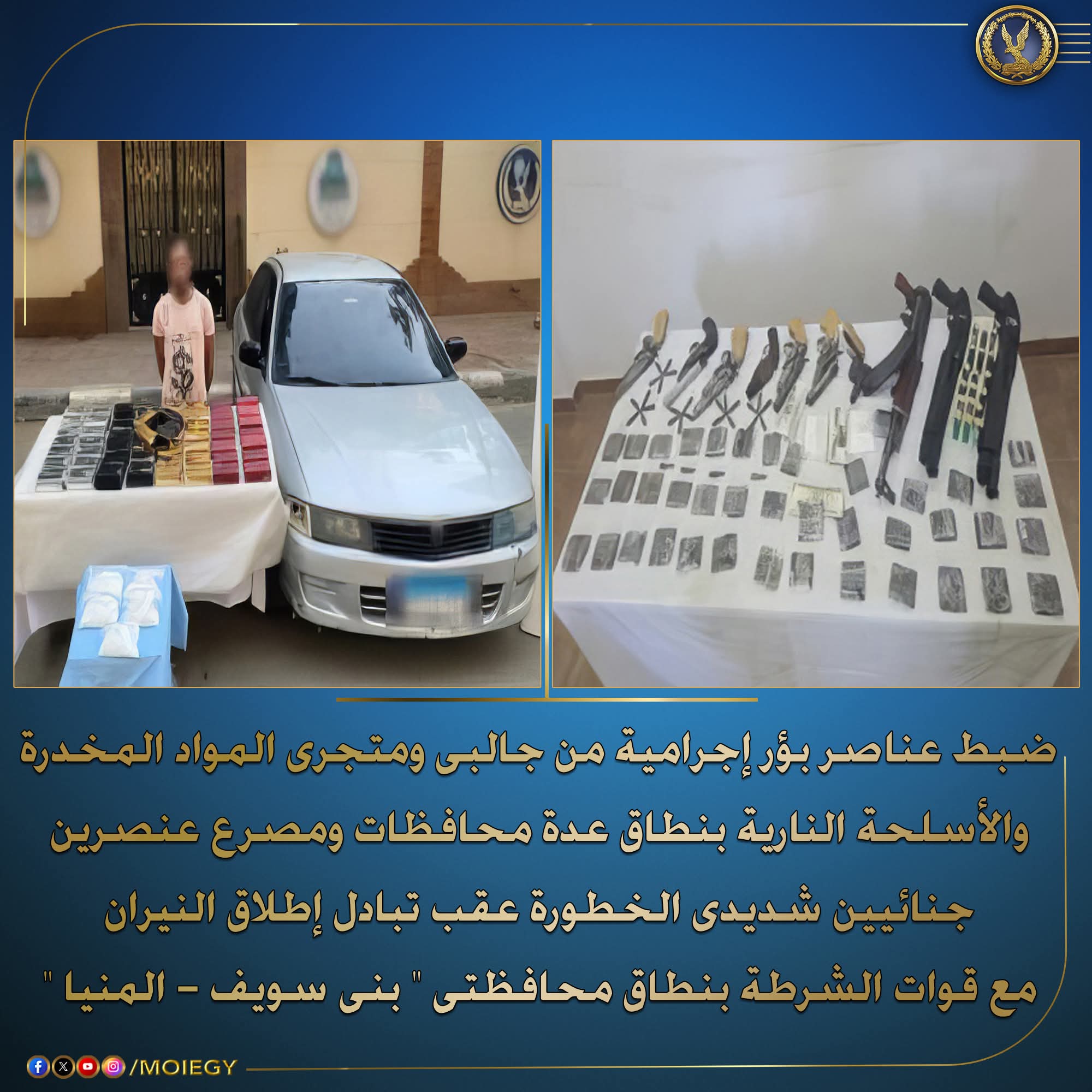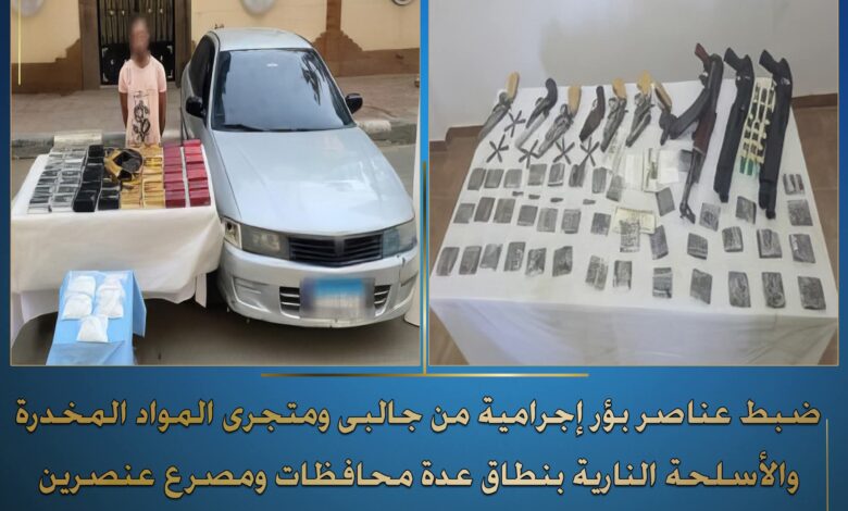 في إطار مواصلة وزارة الداخلية توجيه الضربات الإستباقية للبؤر الإجرامية جالبي ومتجرى المواد المخدرة والأسلحة النارية غير المرخصة.. فقد أكدت معلومات وتحريات قطاعى الأمن العام – مكافحة المخدرات والأسلحة والذخائر غير المرخصة ) بالتنسيق مع أجهزة الوزارة المعنية قيام بؤر إجرامية بنطاق عدة محافظات تضم عناصر جنائية شديدة الخطورة) بمحاولة جلب كميات من المواد المخدرة والأسلحة النارية غير المرخصة تمهيداً للإتجار بها.