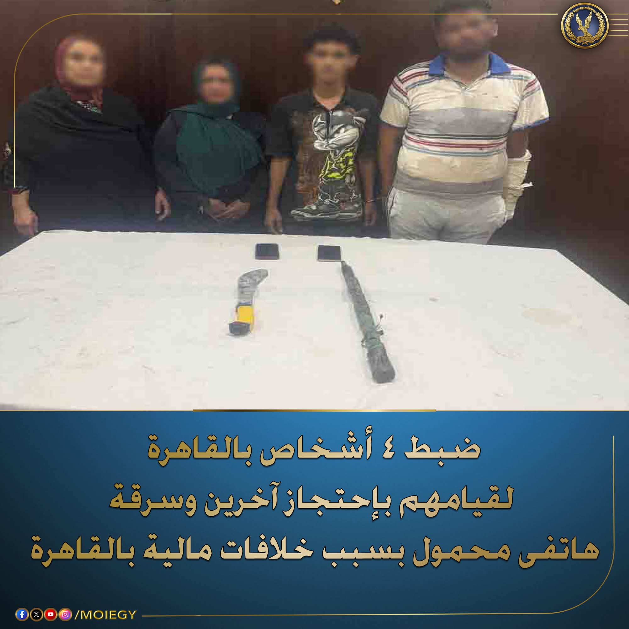 ضبط 4 أشخاص بالقاهرة لقيامهم بإحتجاز آخرين وسرقة هاتفى محمول بسبب خلافات مالية بالقاهرة