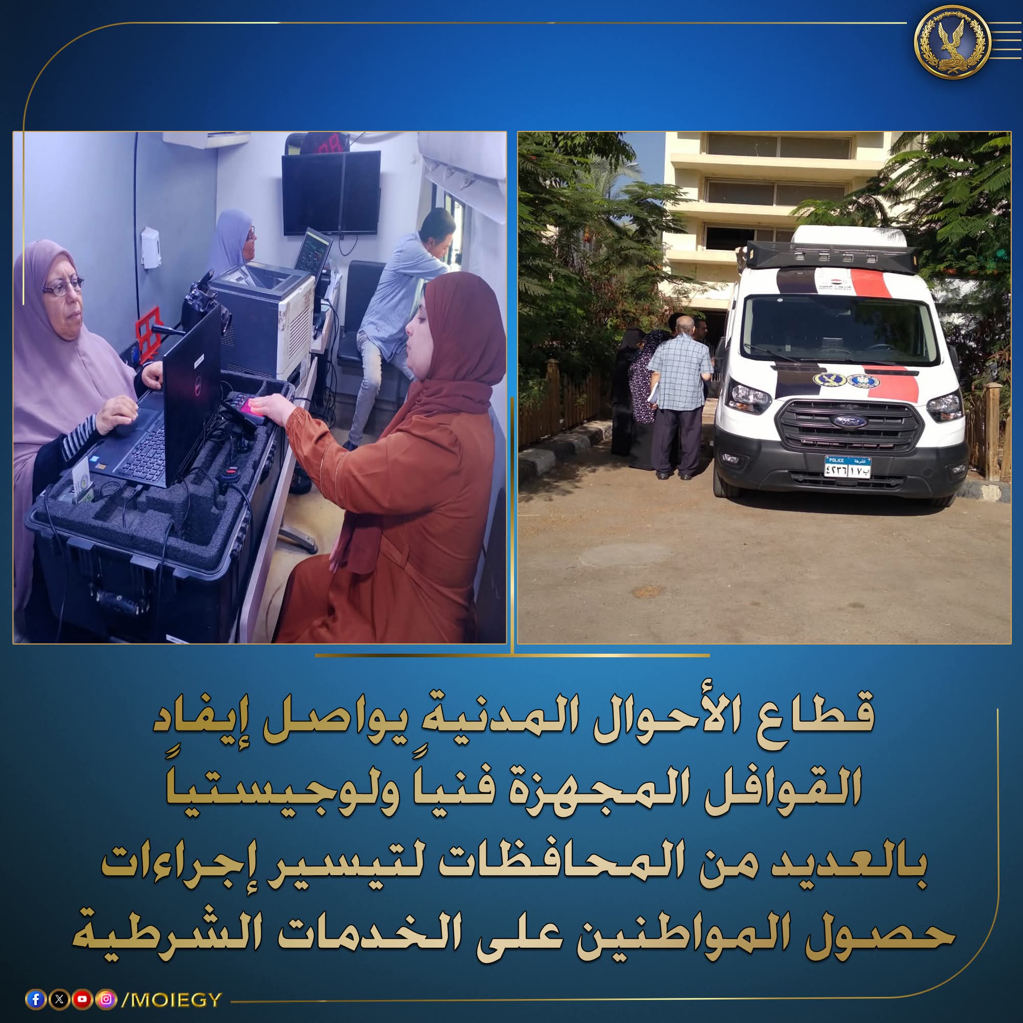 قطاع الأحوال المدنية يواصل إيفاد القوافل المجهزة فنيا ولوجيستيا بالعديد من المحافظات لتيسير إجراءات حصول المواطنين على الخدمات الشرطية