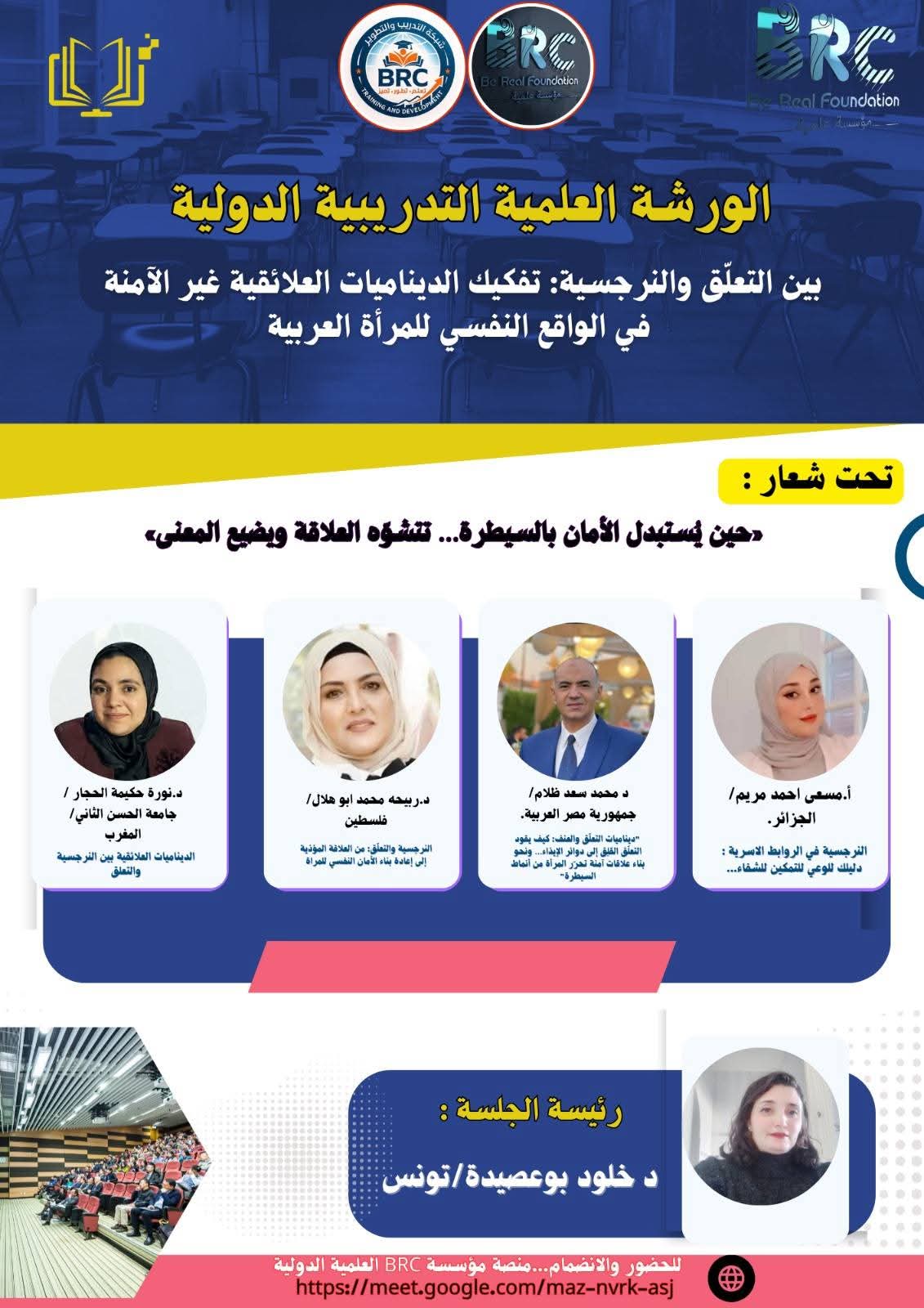#في ظل تعقيدات الواقع النفسي والاجتماعي، ووسط تحديات تتصل بصحة المرأة النفسية وعلاقاتها داخل محيطها الأسري والمجتمعي، تنظم مؤسسة BRC العلمية الدولية وبالتعاون مع جامعات ومؤسسات عربية ودولية، وعبر شبكة BRC للتدريب والتطوير، ورشتها العلمية التدريبية الدولية: “بين التعلّق والنرجسية: تفكيك الديناميات العلائقية غير الآمنة في الواقع النفسي للمرأة العربية”.. والتي تقام تحت شعار: “حين يُستبدل الأمان بالسيطرة… تتشوّه العلاقة ويضيع المعنى”…