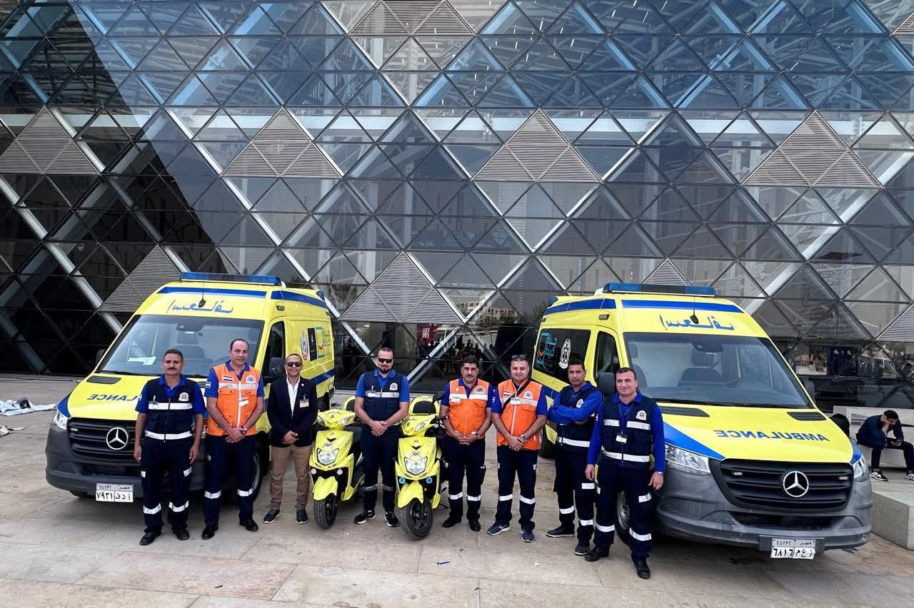 داخل المتحف: عيادة طبية ثابتة مجهزة بأحدث الأجهزة، و8 سيارات إسعاف، وفرق إنقاذ متنقلة، وسكوترات وجولف كار إسعافية لضمان سرعة التحرك في المساحات الداخلية.
