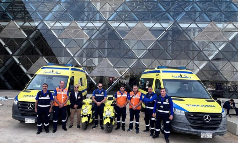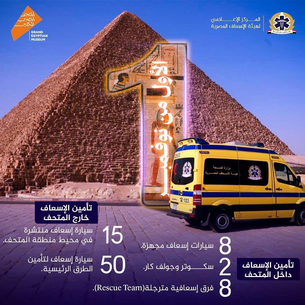 داخل المتحف: عيادة طبية ثابتة مجهزة بأحدث الأجهزة، و8 سيارات إسعاف، وفرق إنقاذ متنقلة، وسكوترات وجولف كار إسعافية لضمان سرعة التحرك في المساحات الداخلية.