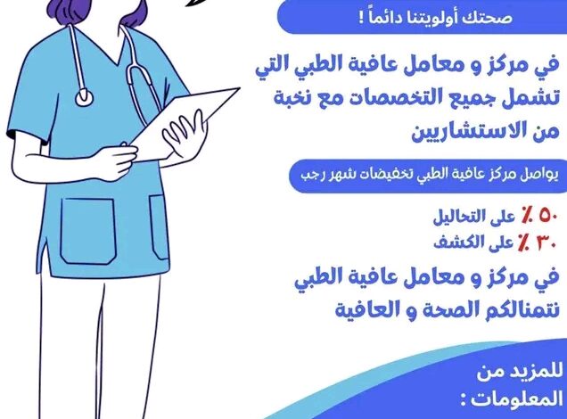بمناسبة حلول شهر رجب والعام الميلادى الجديد كل عام وحضراتكم طيبين يعلم مركز عافية الطبى عن تخفيضات وخصمومات ٥٠٪ على التحاليل بين ٢٠٪ علي الكشف