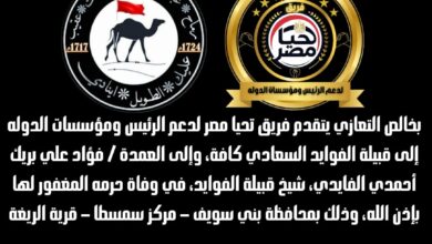 فريق “تحيا مصر” يتقدم بالعزاء الي قبيلة الفوايد السعادي في وفاة حرم العمدة فؤاد علي بريك الفايدي